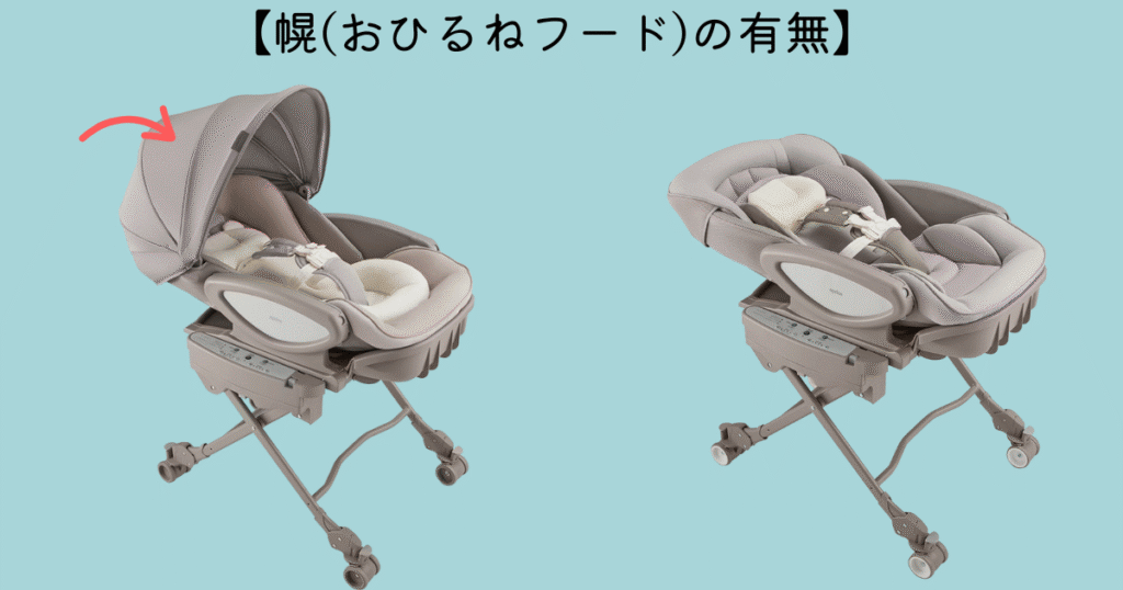 照明を落としたり、カーテンで遮光したりと、日中の寝かしつけ環境を調整できるようなら幌がなくてもOK!その分、価格をおさえてオートスウィングの恩恵を受け取りましょう。