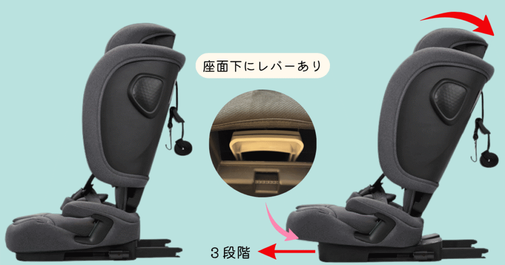座面下のレバーを引くことでシートの角度を3段階調節できます。