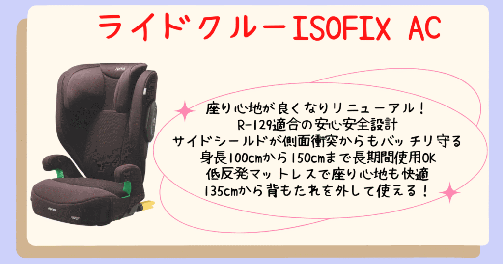 アップリカの3歳半から12歳頃まで使用できると大人気のライドクルーISOFIX。 2025年11月に最新モデルのACが登場しました。