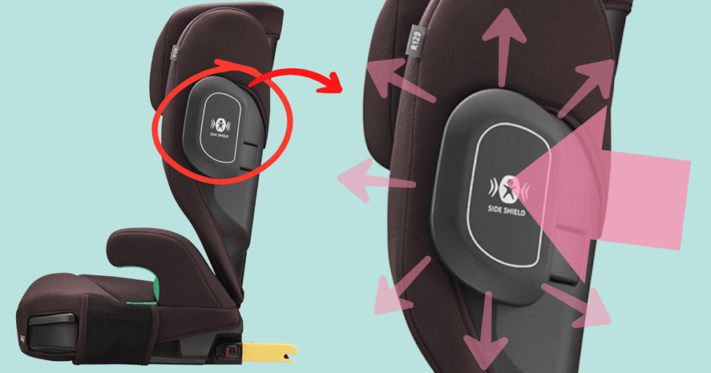 側面衝突に強いサイドシールドに加えて、肩や腰をやさしく守るマシュマロGキャッチ(衝撃吸収パッド)も搭載しています。
