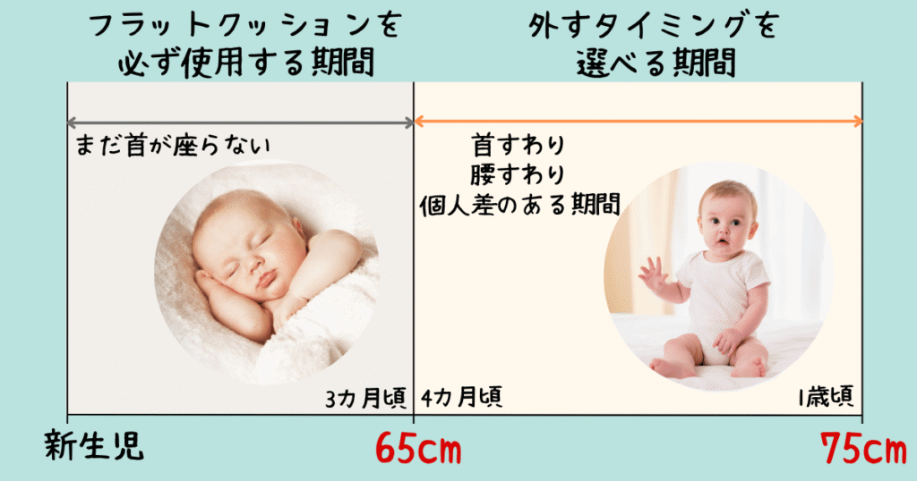 65cmまでは必ず使用し、65cm~75cmの間は保護者の判断、75cmに達したら完全に外しましょう。