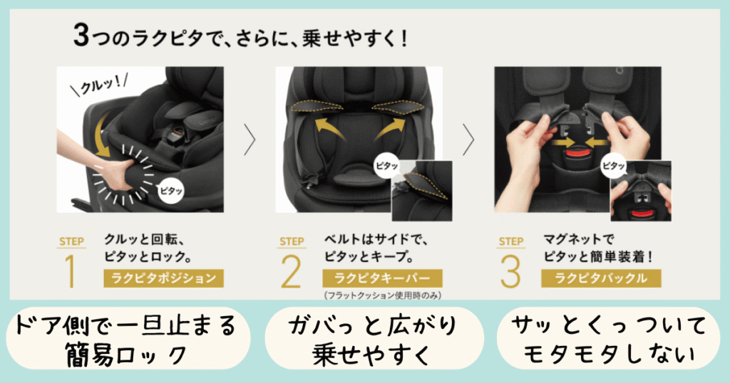 乗せるときにいつも赤ちゃんがごきげんでいてくれるとは限りません。急いでいるときもサッと楽に乗せ降ろしが可能になります。